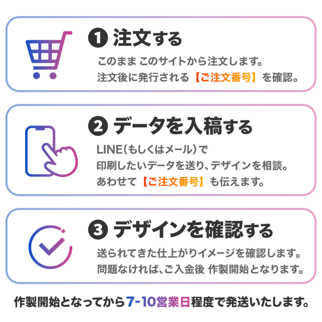 | 納期 | デザイン確定後、7〜10営業日程度 |
