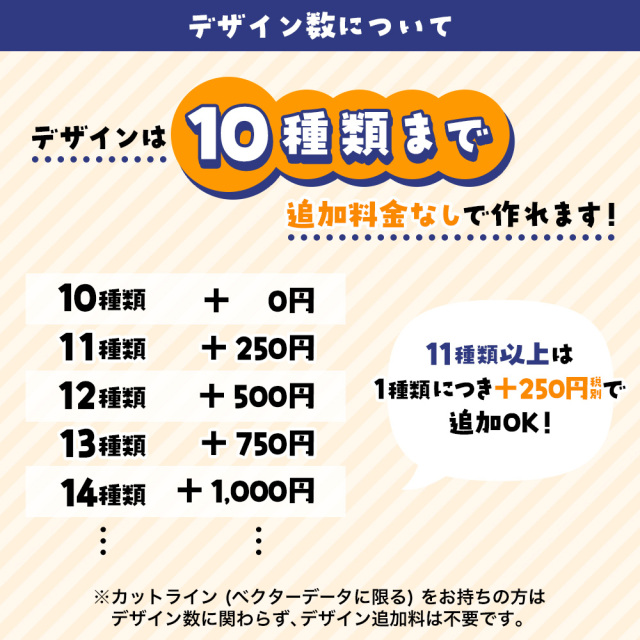 | 入稿 | 【データについて】 ベクターデータ(ai、eps、pdf形式など)もしくは画像(png、jpg、jpeg形式など)(高解像度推奨)でご入稿ください。 【入稿方法】 LINEかメールにてお送りください。 *データサイズが大きい場合・透過画像の場合は LINEでは正常に送れないことがあるため、メールでご入稿ください。 *データサイズが20MBを超える場合は大容量ファイル転送サービスをご利用ください。 |