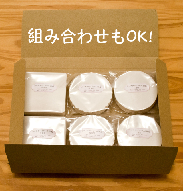 | 製品名: | 紙 コースター クリーム カタチいろいろ 90/1mm 20枚 |