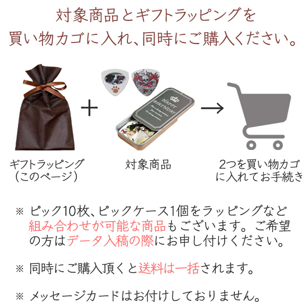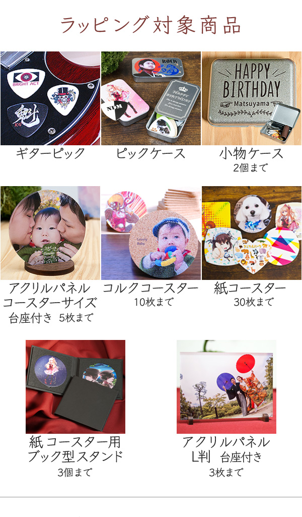 | ラッピング対象商品 | ギターピック ピックケース 小物ケース(2個まで) コルク コースター(10枚まで) 紙 コースター(30枚まで) アクリルパネルコースターサイズ台座付き(5枚まで) 紙 コースター用 ブック型スタンド(3枚まで) アクリルパネルL判サイズ台座付き(3枚まで) | 送料 | 送料はこちらでご確認下さい。(新規ウインドウで開きます) |