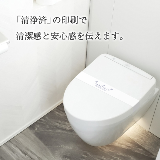 清掃後の安心を提供するサニタリーペーパー。消毒済みであることを示す印刷が施されてます。トイレ等に表示することができ、使用者に清潔感と安心感を伝えます。(水溶性ではありません)