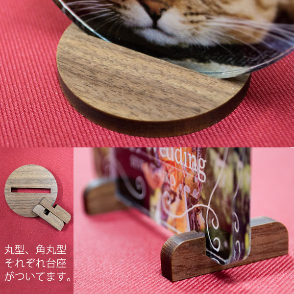 透明感が美しい5mmの厚みのアクリルコースターに写真やイラストをフルカラーにて印刷します。結婚式やファンミーティング等各種イベントでの使用や特典グッズ、販促品や記念写真を飾るオブジェとして大変好評です。台座のあり/なしも選べます