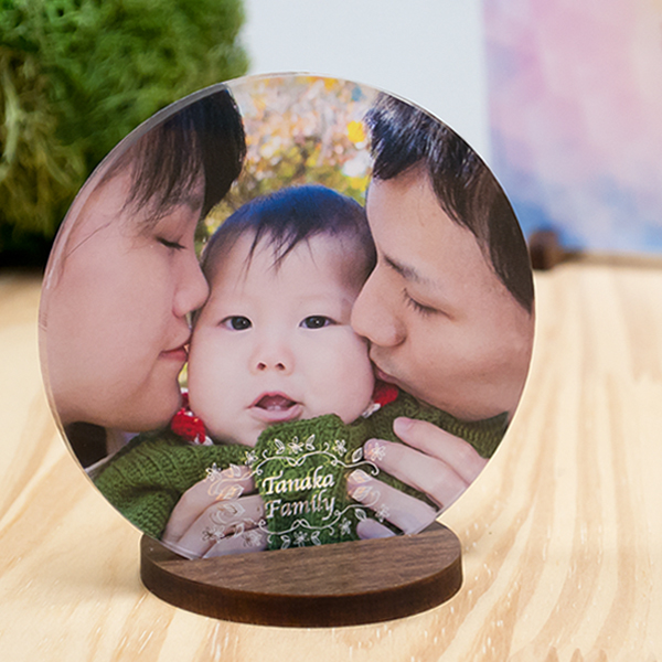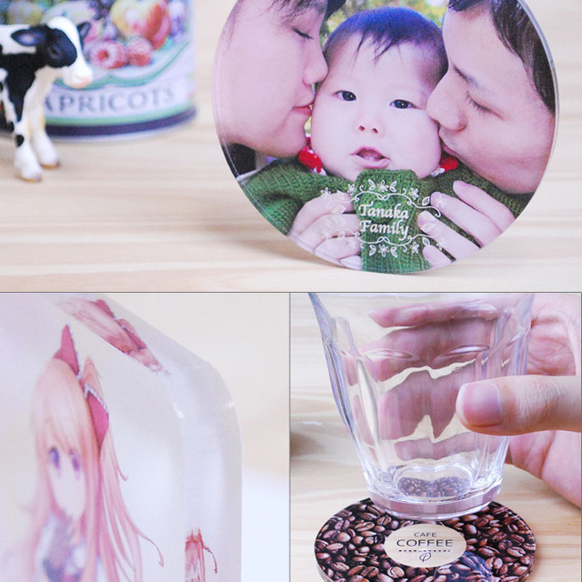 イラストや写真をフルカラーにてコースターサイズのアクリルに印刷します。記念写真やイラストが特別なアイテムになります。